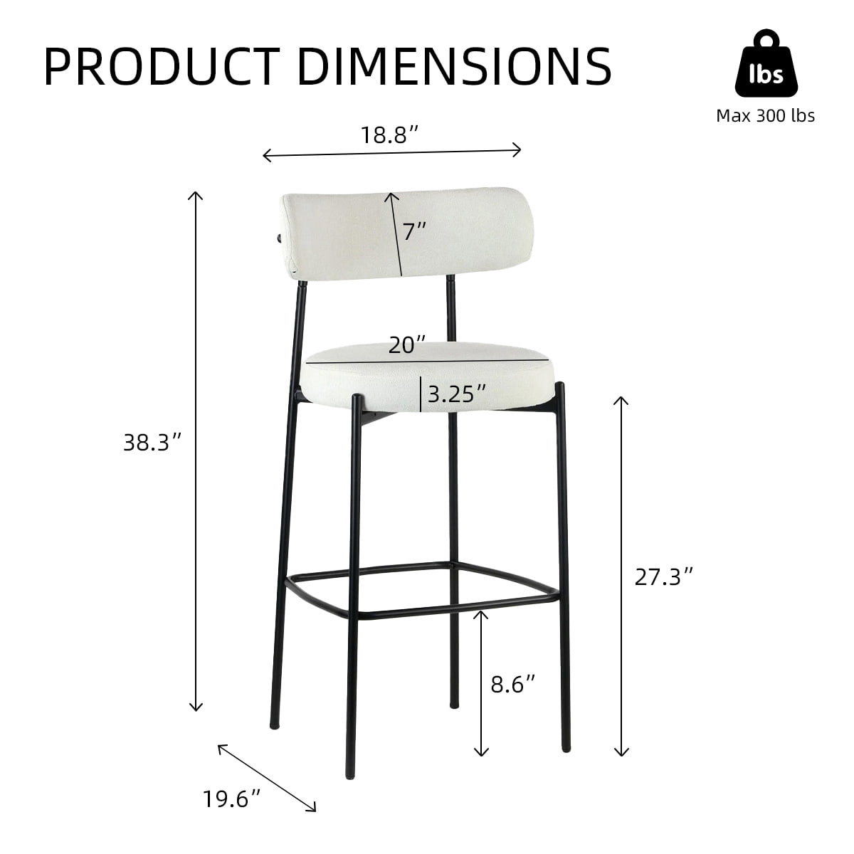 چهارپایه کافهای مدرن سفید بوکله با پایههای فلزی مشکی - صندلیهای میلهای با ارتفاع کانتر با پشتی و زیرپایی برای جزیره آشپزخانه، اتاق غذاخوری، و بار خانه