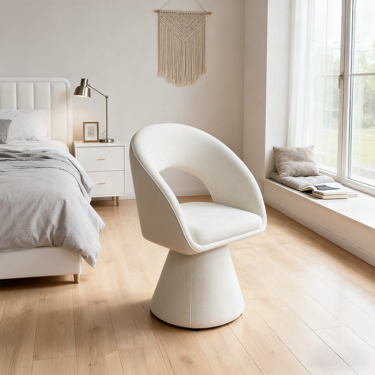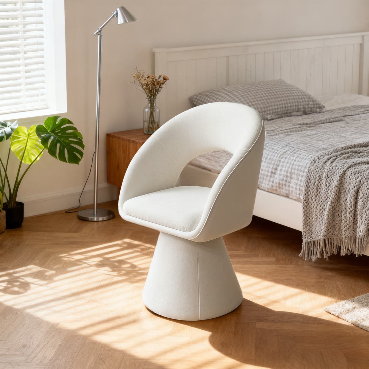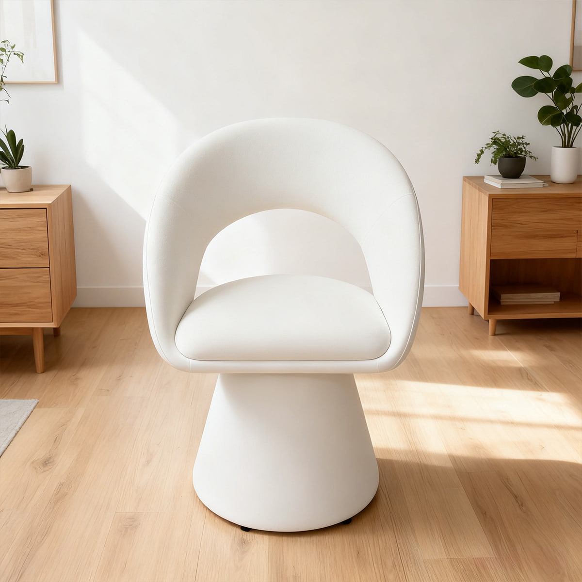 صندلی چرمی کرمی با طرح منحنی مدرن و سفید تدی مخملی – صندلی ناهارخوری و تفریحی روکش دار چرخشی 360 درجه با پشتی توخالی