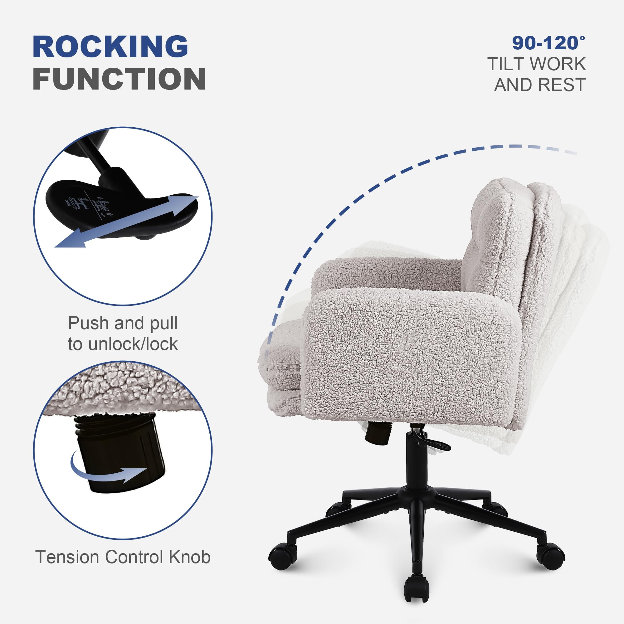 ساختار ارگونومیک، همراه با چرخش صاف 360 درجه، تنظیم ارتفاع، و عملکرد تکان دادن آرامش بخش، آن را برای کار، مطالعه، لباس پوشیدن یا استفاده در اوقات فراغت مناسب می کند. کاستورهای نایلونی بی صدا حرکت بدون زحمت را در حین محافظت از کف تضمین می کنند. این صندلی چه به عنوان صندلی رومیزی، چه به عنوان صندلی روشویی یا صندلی برجسته استفاده شود، راحتی، عملکرد و زیبایی مدرن را یکپارچه با هم ترکیب می کند.