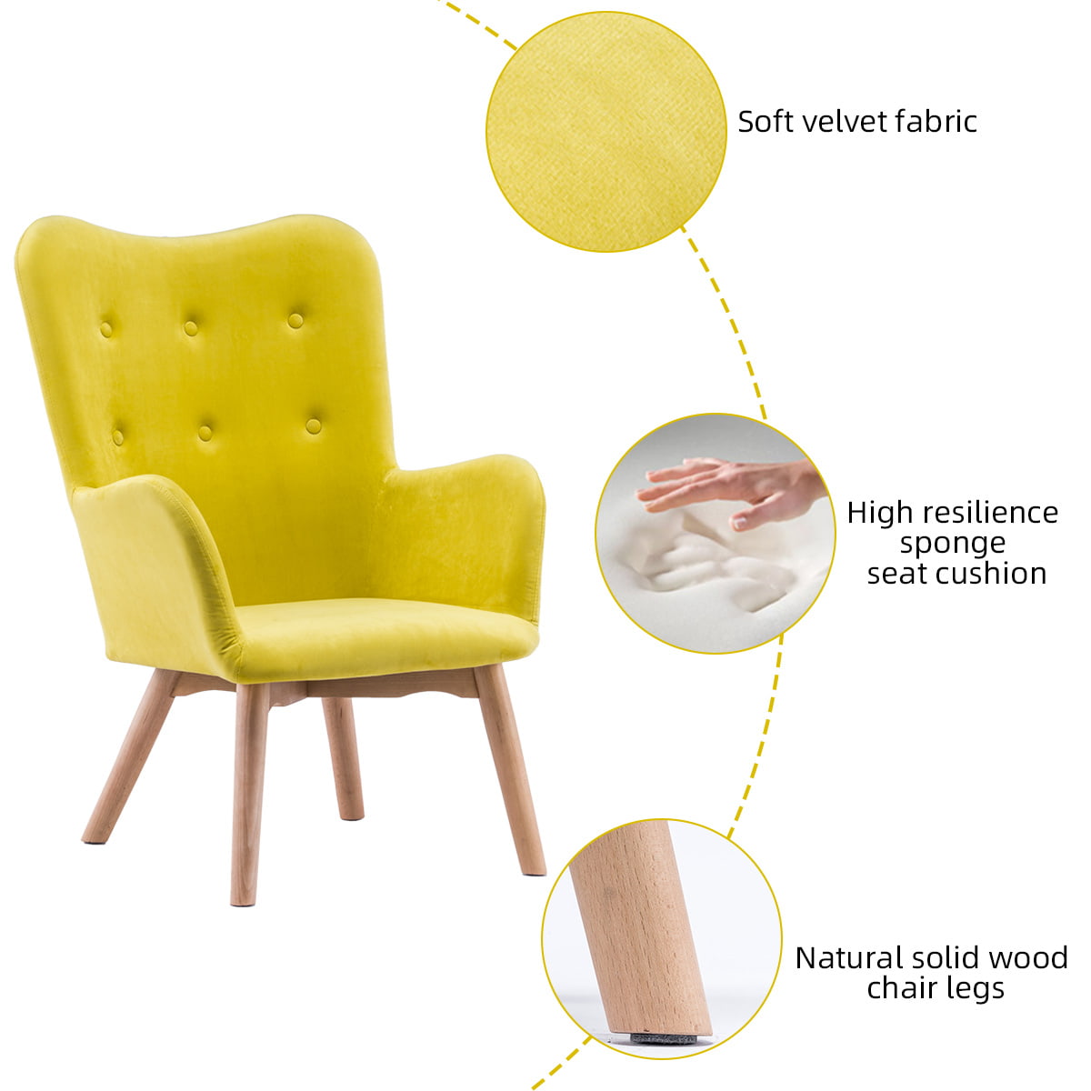 صندلی راحتی مدرن مخملی زرد - صندلی تفریحی با پشت بال با پاها و دسته های چوبی برای اتاق نشیمن، اتاق خواب یا دفتر